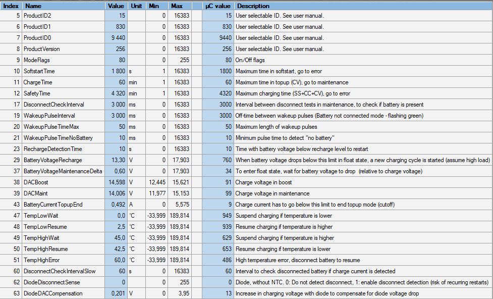 Figure 1 - All configurable parameters for LFP chargers