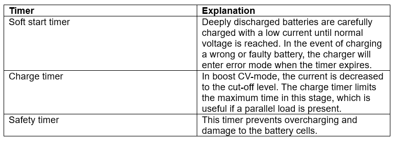 The charger is designed to work with an NTC thermistor in the battery pack for temperature monitoring. If the temperature moves out of operational range, the charger responds differently based on set limits. For a low or high temperature warning, the charger will automatically resume operation once the temperature returns to the acceptable range. In the case of a high-temperature error, the charger will not resume even if the temperature normalises; the battery or mains supply must be disconnected and reconnected to resume charging. The system is adaptable to different NTC thermistors, allowing users and customers to input the nominal resistance value and β value (The correlation between resistance and temperature) using the configuration tool.